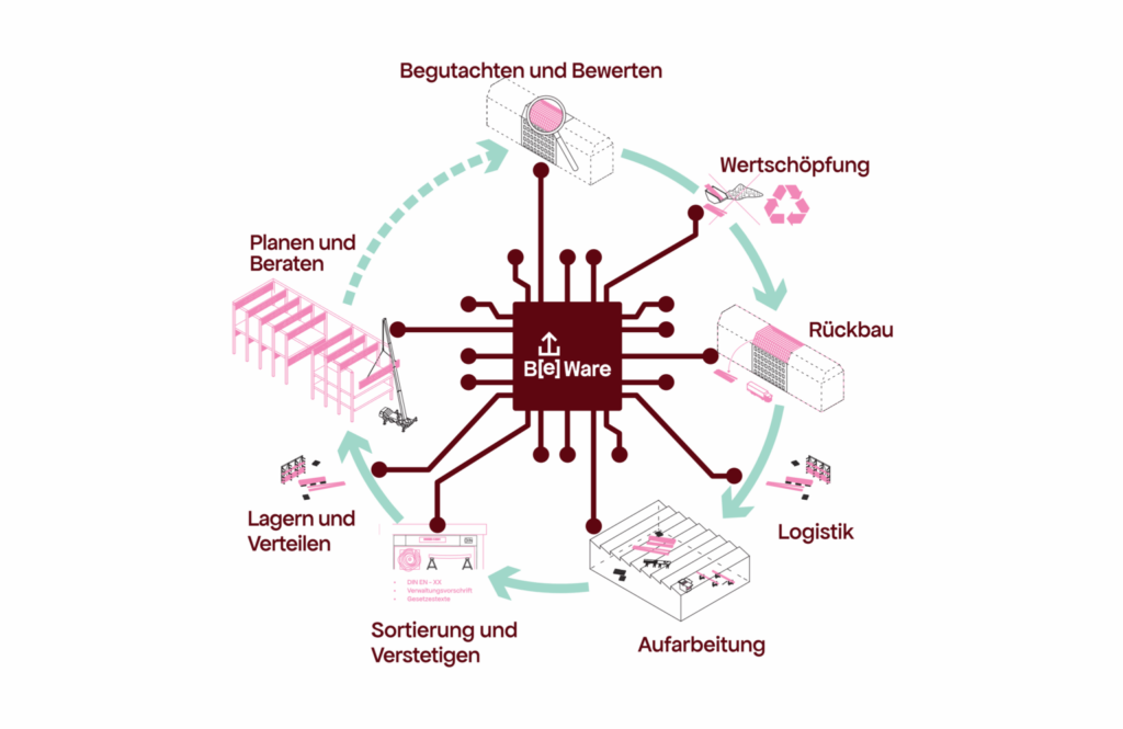 Nach dem Fokus auf Bauholz in der Konzeptphase wird das B(e) Ware Modell nun auf weitere Stoffgruppen übertragen und dafür in dem etablierten Netzwerk geeignete Quellen erschlossen. Vorhandenes Material wird identifiziert, untersucht, zerstörungsarm geborgen und in einem zentralen Lager in Spandau gelagert. Dort erfolgt die Vorbereitung der weiteren Verarbeitung für die Wiederverwendung in Tragstrukturen. Es werden Berlinweit Materialquellen einbezogen und dann in Neu- und Umbauprojekten in verschiedenen Quartieren Berlins eingesetzt: ein Bauvorhaben in Charlottenburg-Wilmersdorf; ein Bauvorhaben in Treptow-Köpenick sowie ein Bauvorhaben in Lichtenberg. Darüber hinaus sollen im Rahmen der Konzeptphase weitere Einsatzorte und kooperierende Vorhaben identifiziert werden. So erprobt B(e) Ware ein Konzept zur vereinfachten Realisierung von anspruchsvollen Gebäudetragwerken aus lokalen Sekundärmaterialien und die kreislaufgerechte Organisation von Wertschöpfungsketten im Bausektor.
